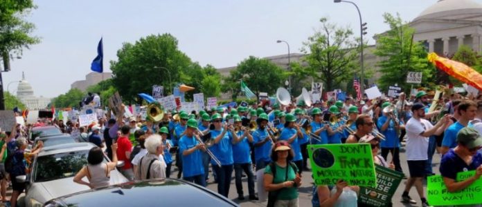 Marchers in Washington, D.C. were upbeat yet frustrated with proposed changes in U.S. policies that favor fossil fuel production, cut funding for scientific research, and leave human and wildlife communities vulnerable to environmental change. The irony of Saturday’s record-high temperatures were not lost on the protesters. One band in attendance, wearing green hardhats, played the song “Hot, Hot, Hot,” an attempt to add humor to an otherwise urgent message.