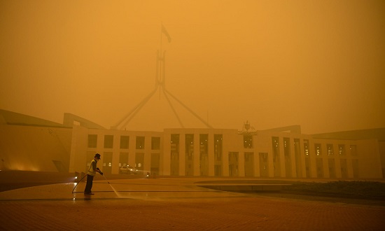 ‘Flames literally surround the city in which the Australian prime minister announced ‘resilience and adaptation’ will substitute for climate mitigation.’ Photograph: Lukas Coch/AAP