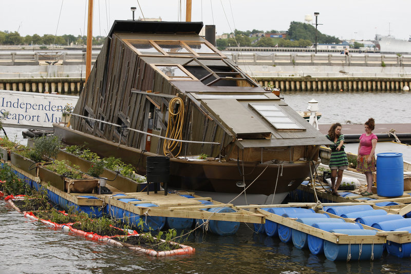 Inspired by images of semi-submerged houses in the aftermaths of Hurricane Katrina and Sandy, the houseboat was created as a demonstration project and semi-self-sufficient habitat, commissioned for the 2014 Fringe Festival. Since then, it has made appearances in New York and exhibitions elsewhere, and been the centerpiece of a series of environmental artworks installed on the river to generate conversation about dealing with climate change and the rising water levels that come with it. It was moored off Bartram’s Garden as part of a joint program between Mattingly, Bartram’s Garden, and the Penn Program on Environmental Humanities that ended in June.