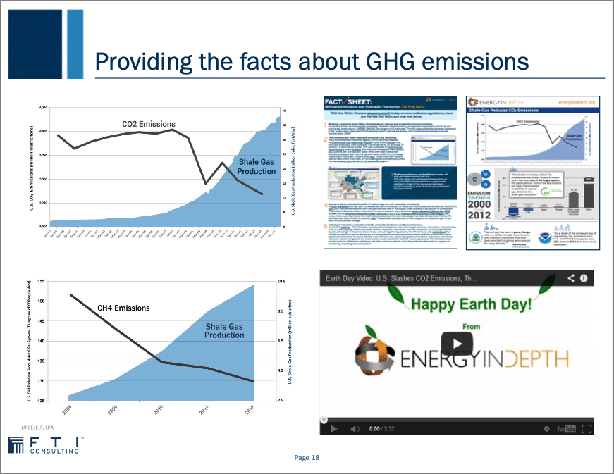 To enter the world of Energy In Depth’s messaging, as seen in FTI’s 2015 presentation, is to enter a world where “the facts about methane emissions” show that the greenhouse gas pollution from “some of the most prolific” U.S. oil and gas fields had dropped “considerably.” Graphs show carbon dioxide and methane emissions plunging as shale gas production takes off. “Happy Earth Day! From Energy In Depth,” an accompanying video still reads.