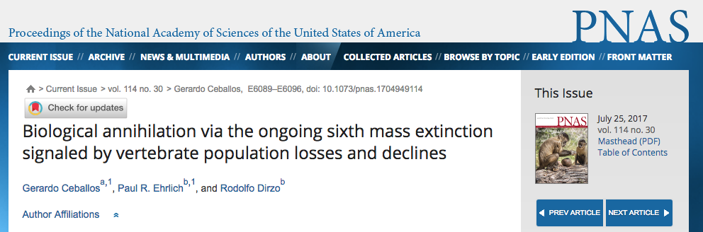 Coming second is, “Biological annihilation via the ongoing sixth mass extinction signaled by vertebrate population losses and declines”, published in the Proceedings of the National Academy of Sciences of the United States of America (or “PNAS” for short) with an Altmetric score of 2,845.