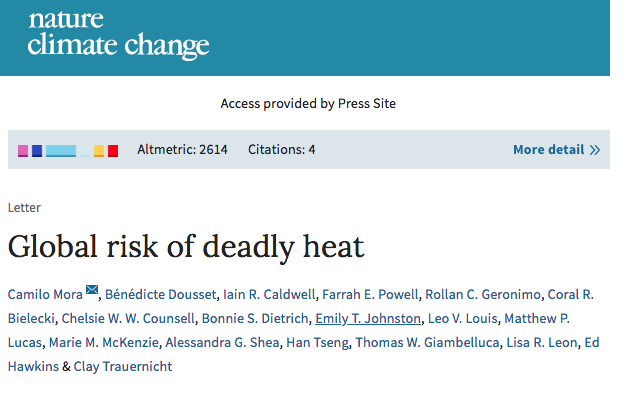 Taking third place with a score of 2,614 is the Nature Climate Change paper, “Global risk of deadly heat”, by lead author Dr Camilo Mora from the University of Hawai’i.