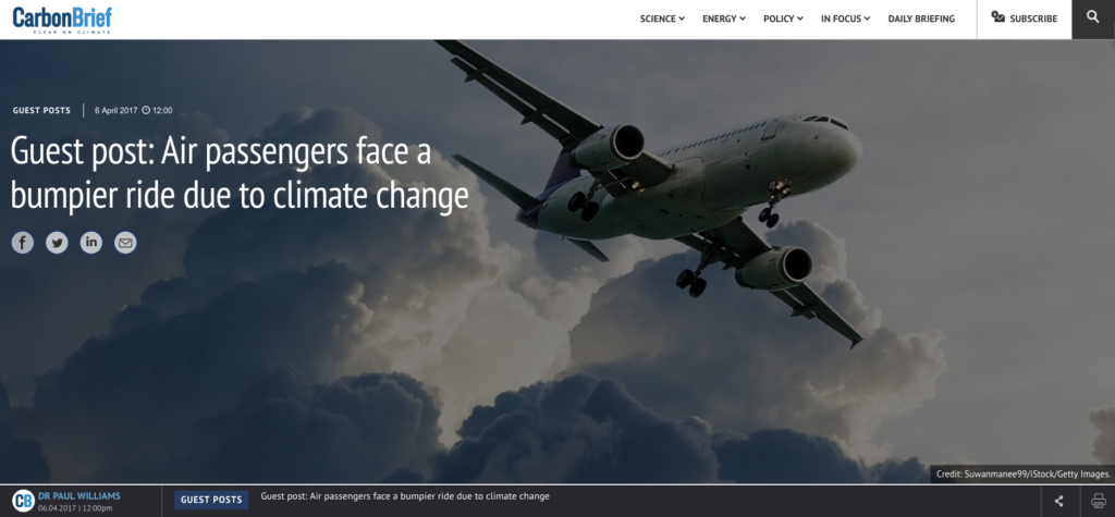 The study’s author, Prof Paul Williams from the University of Reading, wrote Carbon Brief a guest article on his research. Williams described how severe air turbulence “is set to become twice or even three times as common by the latter half of the century”.