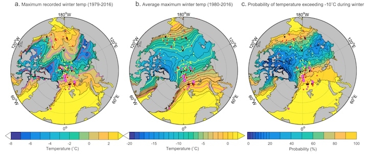 They defined a “warm” event as any time when the temperature rose above 14°F (minus-10°C). That’s chilly by winter standards for most regions of the globe, but is significantly warmer than the minus-22°F (minus-30°C) temperatures that are the norm for the Arctic in winter. They also looked at other extremes up to 32°F (0°C).