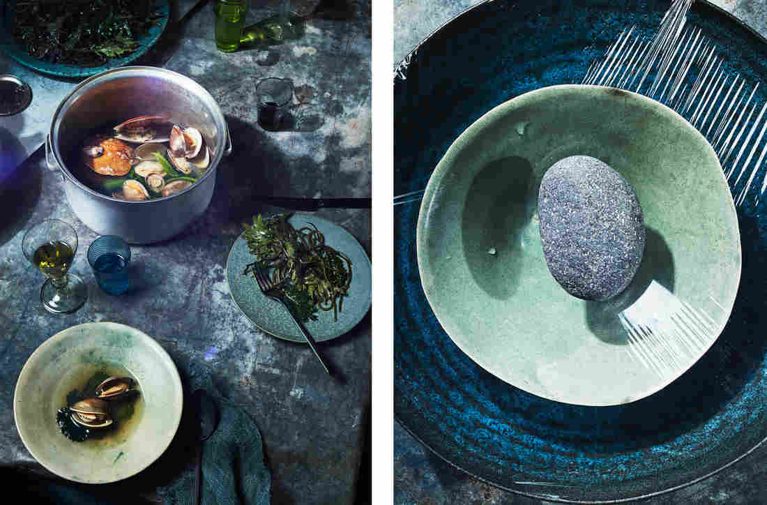Left: Mollusks in broth with mustard greens. Mustard greens are hardy plants that could withstand climate fluctuations. Right: A DIY method for desalinating ocean water for cooking and drinking. Heami Lee/Courtesy of Allie Wist, food stylist C.C. Buckley, prop stylist Rebecca Bartoshesy hide caption