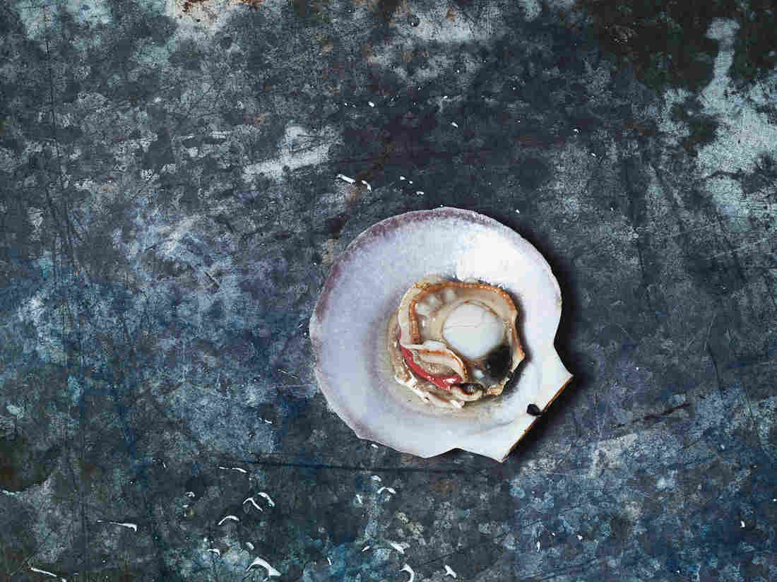 This dish features a scallop in its shell. Bivalves, like scallops are threatened by rising ocean acidification. Wist left it in the shell, so people would think of it “as an animal and not just a scallop on a plate.” Heami Lee/Courtesy of Allie Wist, food stylist C.C. Buckley, prop stylist Rebecca Bartoshesy hide caption
