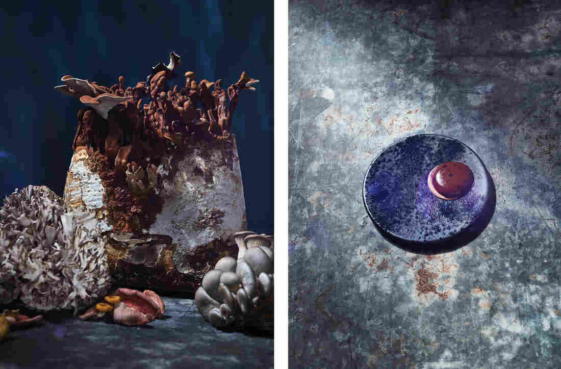 Left: Mushrooms have incredible potential as a future food source and can absorb toxins from the soil, says Wist. Right: Carob agar-agar pudding with whipped cream. Carob is substituted for chocolate, as cocoa production is threatened by rising temperatures. Heami Lee/Courtesy of Allie Wist, food stylist C.C. Buckley, prop stylist Rebecca Bartoshesy hide caption