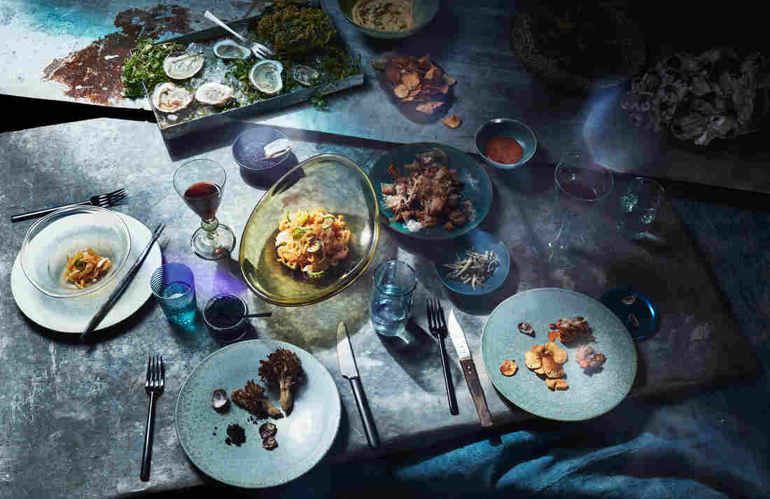 Allie Wist’s “Flooded” dinner spread includes burdock and dandelion root hummus with sunchoke chips; jellyfish salad; roasted hen of the woods mushroom; fried potatoes with chipotle vegan mayo; salted anchovies; and oysters with slippers. Most of these are foods that might be more resilient to climate change and, therefore, what we could be eating in the future, Wist says. Heami Lee/Courtesy of Allie Wist, food stylist C.C. Buckley, prop stylist Rebecca Bartoshesy hide caption