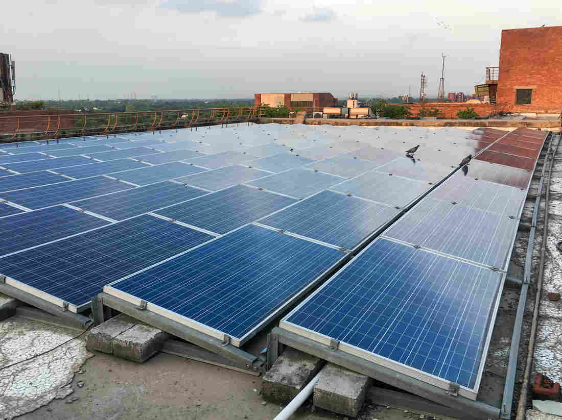 When solar panels are clean — like the ones on the rooftop of Delhi’s Habitat Center, a conference and office complex in the central part of the city — solar energy production typically doubles, according to a new study led by Duke University researchers. Julie McCarthy/NPR hide caption