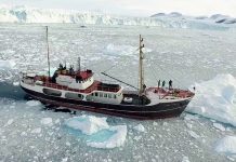 The research ship M/V Cape Race on Greenland's northwest coast during OMG's survey of the seafloor. Credit: NASA/JPL-Caltech.
