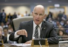 California Gov. Jerry Brown, left, responds to a question while testifying in support of Assembly Bill 398, by Assemblyman Eduardo Garcia, D-Coachella, one of...