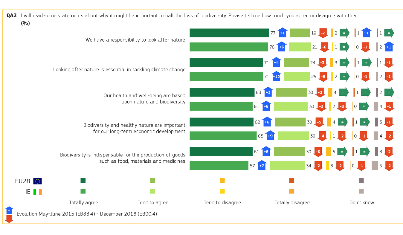 Ireland also saw one of the largest increases – up by six percentage points to 76 per cent – in the proportion of respondents who “totally agree” with the statement that “we have a responsibility to look after nature”.