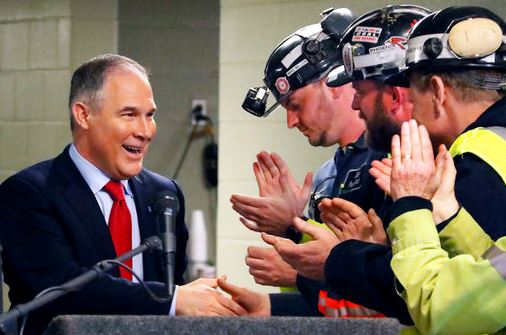 | In this April 13, 2017 file photo Environmental Protection Agency (EPA) Administrator Scott Pruitt, left, shakes hands with coal miners during a visit to Consol Pennsylvania Coal Company’s Harvey Mine in Sycamore, Pa. The Trump administration wants to trash Obama-era rules to limit water pollution from coal-fired power plants. Pruitt announced the change this week. Administrator Scott Pruitt sent a letter to a coalition of energy companies that lobbied against the 2015 water pollution rule. (AP Photo/Gene J. Puskar, File) |