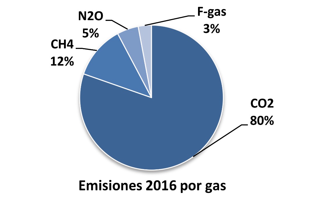 En cuanto al tipo de gas de efecto invernadero, el 80 % de lo emitido fue dióxido de carbono (CO2), el 12 % metano (un gas unas veinte veces más potente que el CO2 en su contribución al cambio climático), el 5 % dióxido de nitrógeno (N2O) y el 3 % gases fluorados, que han caído desde que pesa sobre ellos un impuesto ambiental.