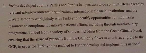 That means Turkey should be allowed to apply for money from development banks, even on projects where they are partnered with the GCF. But it adds the share of the cash coming from the climate fund should only go to eligible countries – which excludes Turkey.