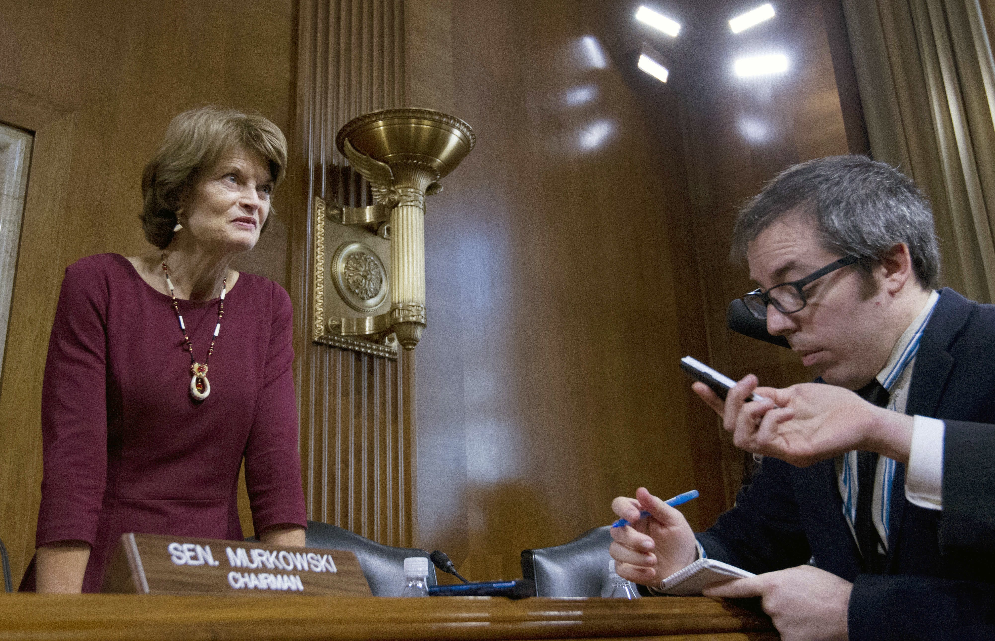 Senate Energy and Natural Resources Committee Chair Sen. Lisa Murkowski, R-Alaska, speaks with reporters after the Energy and Natural Resources Committee hearing on Capitol Hill in Washington, Wednesday, Nov. 15, 2017, to consider, pursuant to H.Con.Res.71, the Concurrent Resolution on the Budget for Fiscal Year 2018, reconciliation legislation to authorize the Secretary of the Interior to establish and administer a competitive oil and gas program in the non-wilderness portion of the Arctic National Wildlife Refuge, known as the "1002 Area" or Coastal Plain. ( AP Photo/Jose Luis Magana)