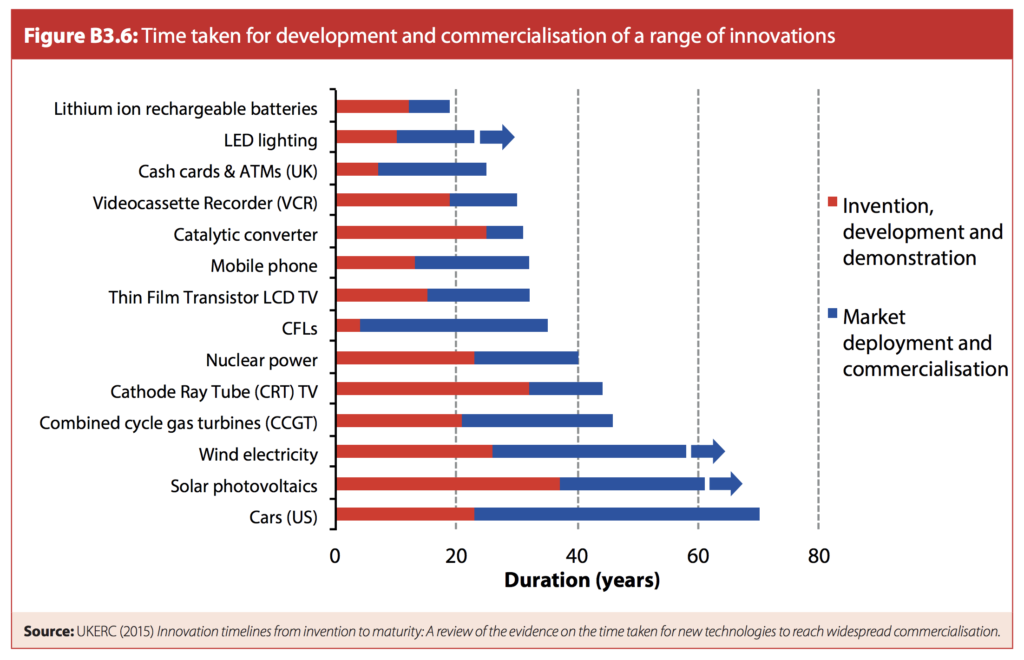 Many technologies, including photovoltaic solar panels, have taken longer. The figure below comes from work commissioned by the CCC (page 63; pdf) and illustrates the time it has taken from inception to mass deployment for new technologies.