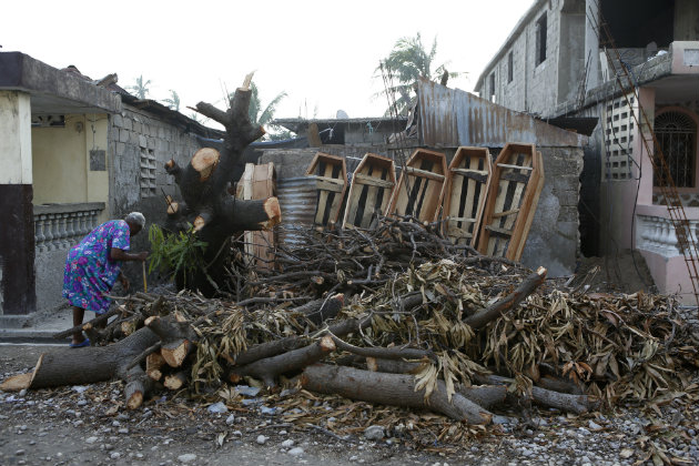 A woman cleans debris around a home after Hurricane Matthew struck in 2016.