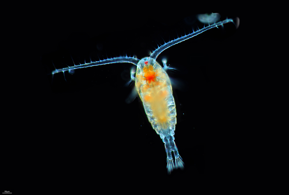 A calanoid copepod, a type of zooplankton. Species of warm-water copepod in the North Atlantic have shifted northward in recent decades. Credit: Proyecto Agua.
