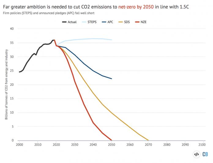 Global CO2 emissions from energy and industry, billions of tonnes. Black: historical emissions. IEA stated policies scenario (STEPS): light blue. Announced pledges scenario (APC): dark blue. Sustainable development scenario (SDS): pink. Net-zero emissions by 2050 (NZE): red. Source: IEA net-zero roadmap, World Energy Outlook 2020, Dr Glen Peters and Carbon Brief analysis. Chart by Carbon Brief using Highcharts.