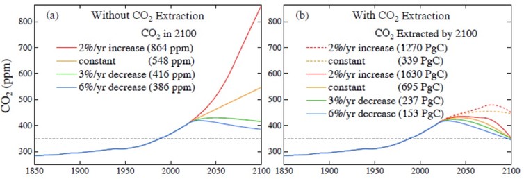 But that’s only if we make significant reductions in rates of emissions right now. If we delay, then future generations would need to extract over ten times more CO₂ beyond the end of this century.
