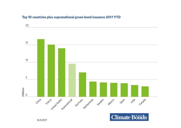 Globally, the volume of bonds issued in 2017 that align with CBI standards passed the $100 billion mark this month. India is the ninth biggest national issuer, lagging behind China, France and the US.