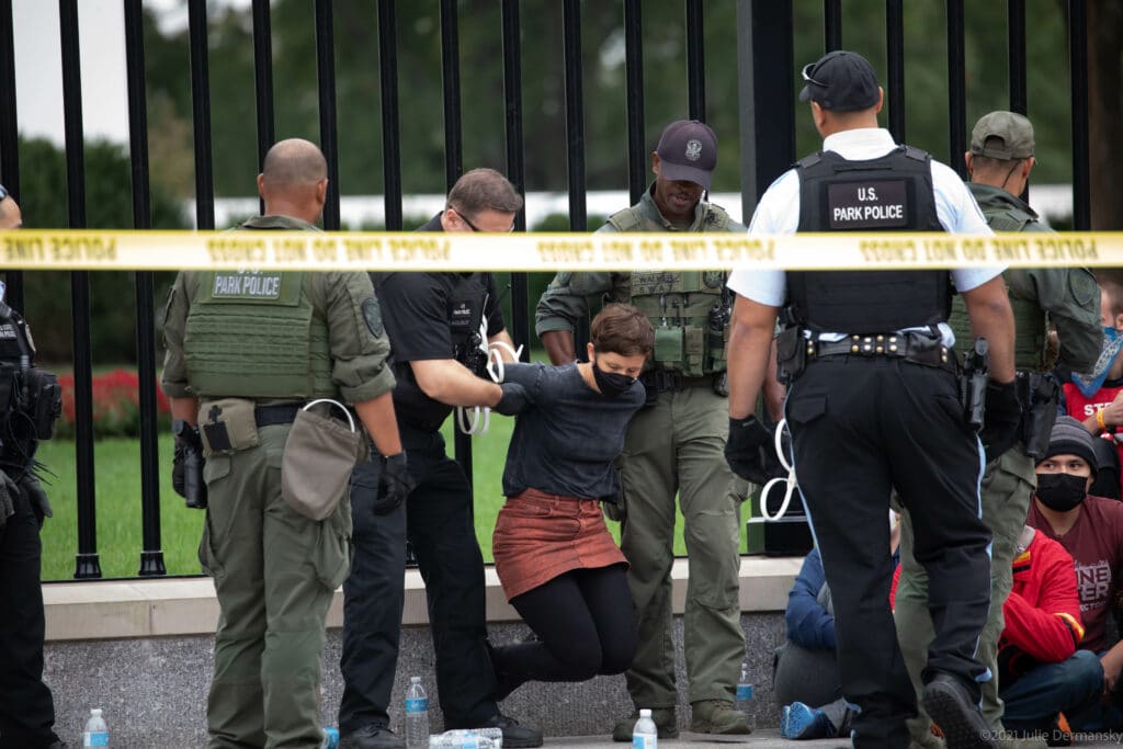 While those who remained in front of the White House were being led away to be processed in tents nearby, the crowd cheered them on from Lafayette Square. Among them was a young girl who chanted, “Thank the water protectors,” over and over. She was given a megaphone and then led a “Water is life” chant, a rallying cry borne out of the Indigenous-led movement against the Dakota Access pipeline in North Dakota.