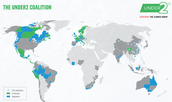 The Under2 coalition has now been signed or endorsed by 187 governments. Signatories agree to reduce their CO2 emissions drastically by the middle of the century.