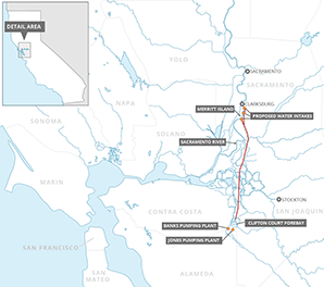 Though the map is similar, the tunnels would run 35 miles, as opposed to the canal’s 43. The tunnels would have a maximum capacity of 9,000 cubic feet of water per second taken from three intakes, far lower than the 21,800 cfs of the canal.