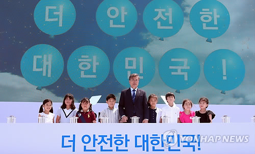 Le président Moon Jae-in participe avec des enfants à la cérémonie de proclamation de la fermeture définitive du réacteur nucléaire Kori-1 le lundi 19 juin 2017 à Busan, dans le sud-est du pays. Le premier réacteur nucléaire sud-coréen a été fermé dimanche à minuit.