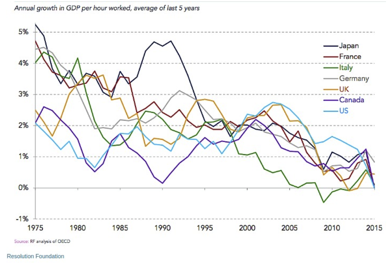 On April 3 in the Guardian there was an article about Christine Lagarde of the IMF concerned that the growth of productivity in many “developed countries” has been falling. There is a problem for the finance sector if growth falls away since additional income is needed for people to be able to service and repay their debts. Without growth the finance sector is destabilised and, indeed, it has been necessary to bring down interest rates to manage the situation.