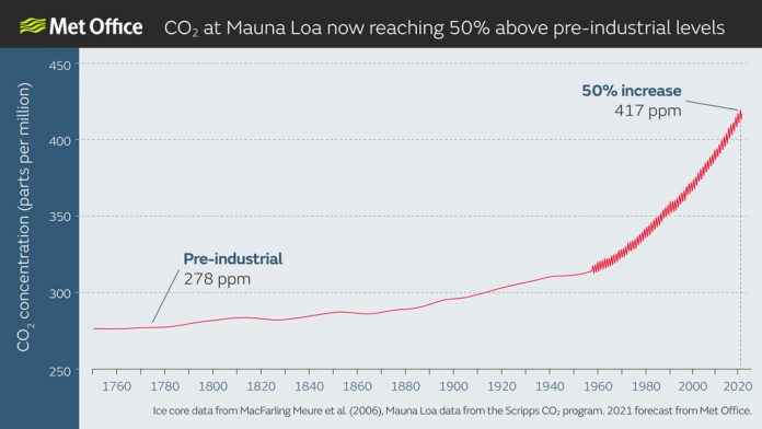 The post Met Office: Atmospheric CO2 now hitting 50% higher than pre-industrial levels appeared first on Carbon Brief.