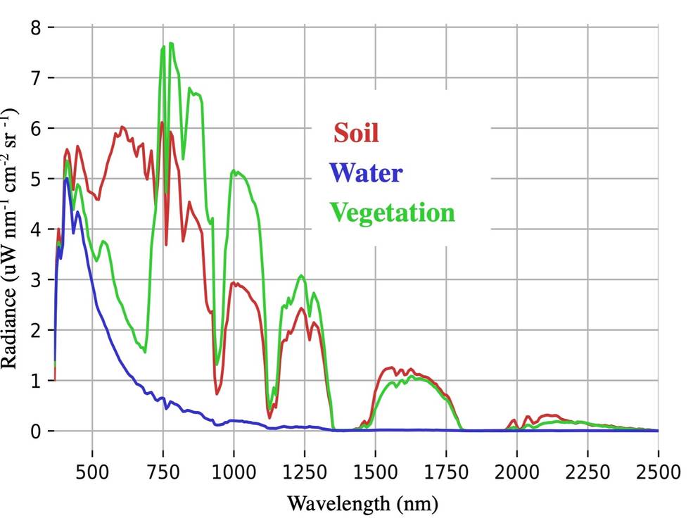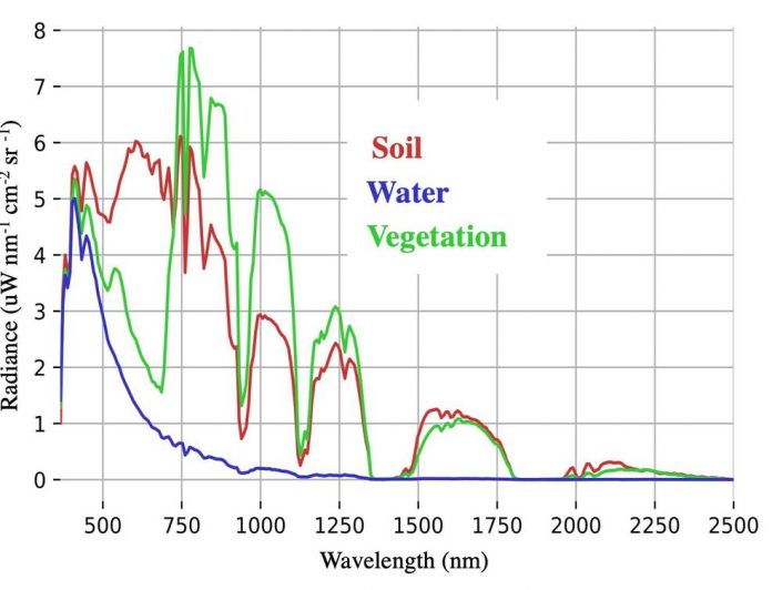 The line graph shows spectral fingerprints for soil, vegetation, and a river. Radiance indicates the amount of each wavelength of light (in nanometers) reflected from a substance. Credit: NASA/JPL-Caltech