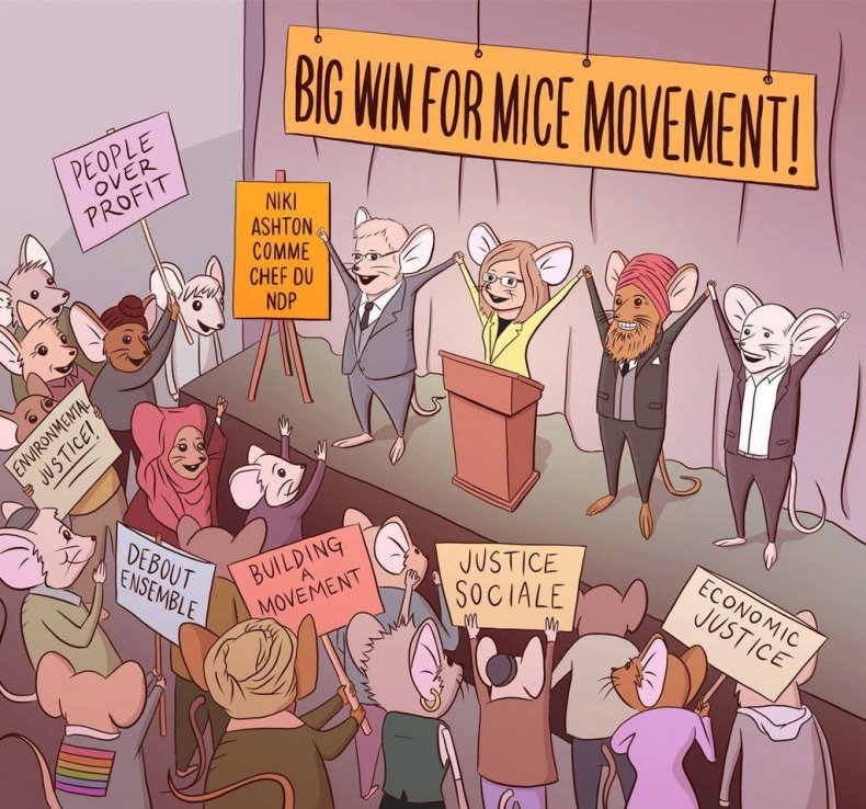 An image from the version of Mouseland, the fable famously told by Tommy Douglas, that was put out by Niki Ashton’s campaign. Mouseland is about mice who keep trying to solve their problems by electing two different kinds of cats to lead them, until one mouse wonders why they don’t elect fellow mice instead. Image via Niki Ashton Facebook