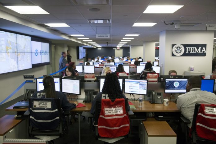 Employees sit in front of computer monitors at the command center of FEMA headquarters in Washington, shortly before a visit by U.S. President Donald Trump on Aug. 4, 2017.