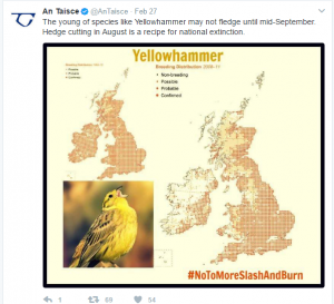 The effects of this on Ireland’s wildlife could be catastrophic. Birdwatch Ireland gave the curlew situation as an example. There are only 125 curlew left in Ireland. “They begin seeking nests and breeding territories in March and they will not breed if the vegetation is burned. “This change in the rules would be the last straw for curlews. There would be too few left and they would die out,” The Yellowhammer would further threats also.