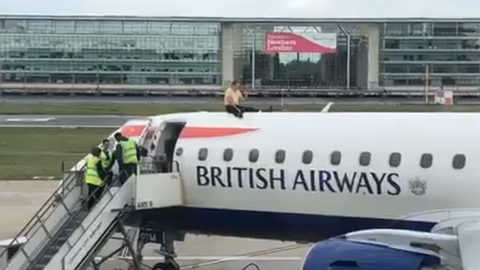 Paralympics medalist James Brown climbed on top of a British Airways plane at London City Airport, in a protest aimed at the site’s £480m expansion plans.