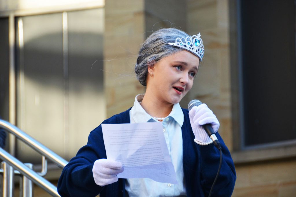 A climate protester dressed as the British monarch reads aloud from a speech on Buchanan Street photo: Kayle Crosson