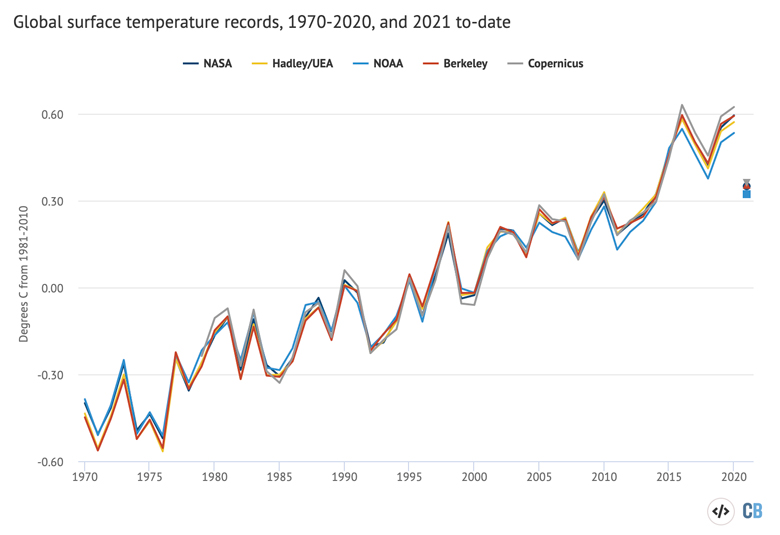 Annual global mean surface temperatures from NASA GISTEMP, NOAA GlobalTemp, Hadley/UEA HadCRUT5, Berkeley Earth, and Copernicus/ECMWF (lines), along with 2021 temperatures to-date (January-March, coloured dots). Anomalies plotted with respect to a 1981-2010 baseline. Chart by Carbon Brief using Highcharts.