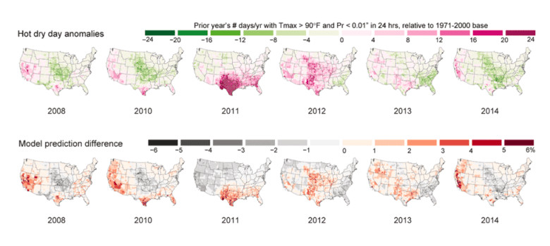 Figure 2. Geographic signature of the hot, dry day anomaly, September 2012 through March 2015. Top row: hot dry day anomalies by year. Bottom row: differences between perceived experience with climate change at the county level for years 2009-2014 using the Yale Climate Opinion Maps model (Howe et al. 2015) and estimates of perceived experience using a model with hot dry day anomalies added. (Source: Marlon et al. 2021)