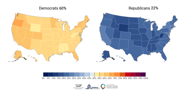 Figure 1. Percentage of Republicans and Democrats who say they have personally experienced the effects of global warming, by state, 2008-2018. Data from Mildenberger et al. 2017. For Democrats, estimates range from 53% in Wyoming to 66% in Oregon. For Republicans, estimates range from 14% in West Virginia and Wyoming to 48% in Hawaii and New York. (Source: Marlon et al. 2021)