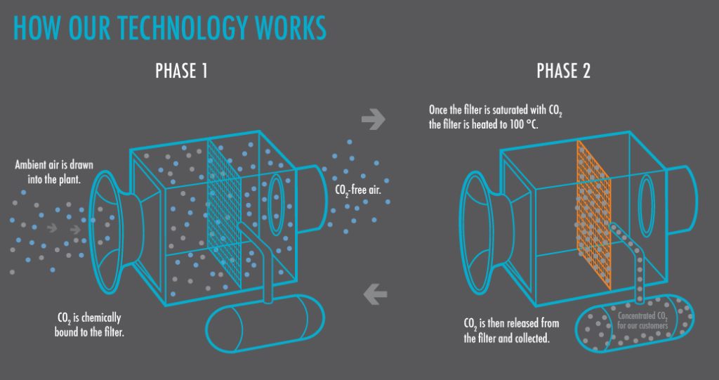 It works by adsorption–desorption, with fans blowing ambient air over the capture material, which traps CO2 and water, until they are released with heat. Water is a by-product of the process. The machinery is capable of capturing 900tCO2 per year.