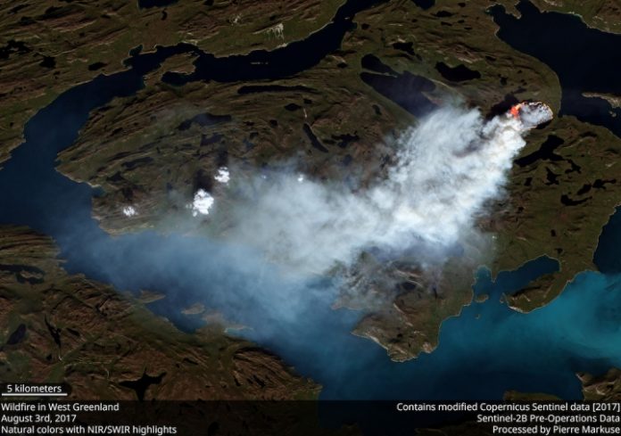 The Sentinel-2 satellite captured a wildfire burning in western Greenland.