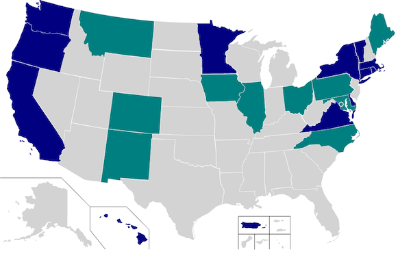 States that have joined the United States Climate Alliance (dark) and others who have expressed support for the Paris accord (light) (Source: Thekiller160)