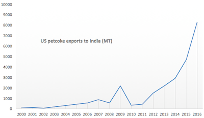 In many parts of the world, petcoke is restricted because of its toxicity. In India however, the fuel is unregulated and burned freely. In this regulatory void, demand has soared, rising 23% a year for the last five years. The country imported 20 times more petcoke in 2016 than it did in 2011.
