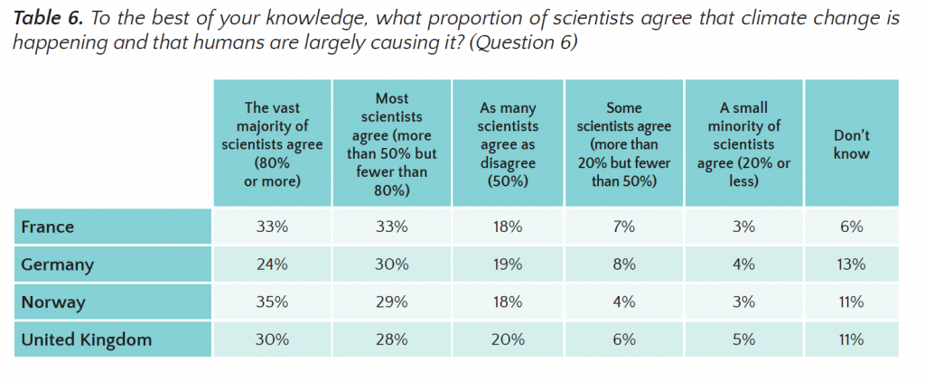 • Only minority percentages (24% in Germany, 30% in UK, 33% in France and 35% in Norway) believe that there is a strong scientific consensus (held by more than 80% of scientists) on climate change.