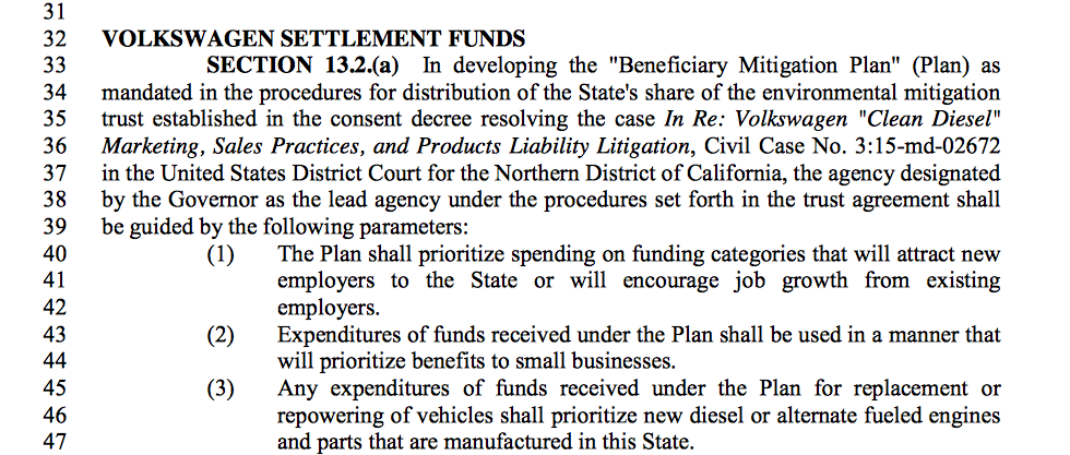 Screenshot of the Senate’s budget language around the Volkswagen Mitigation Trust.