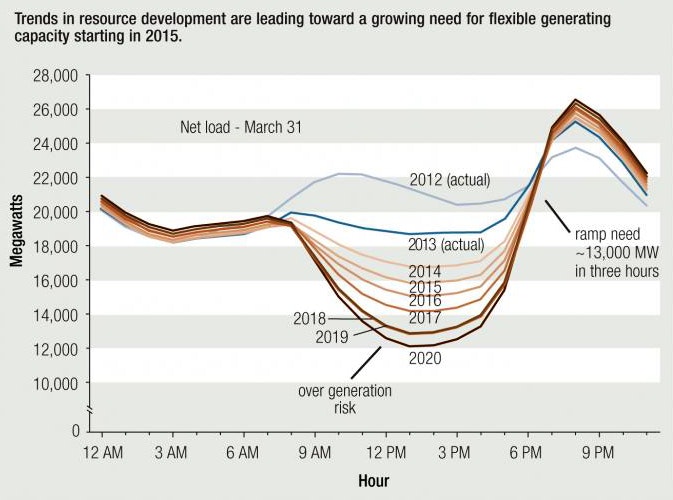 These include energy storage, such as massive batteries to store power at homes and businesses when there’s a surplus on the grid; proliferation of electric vehicles, which are essentially rolling batteries; and even encouraging consumers to use more power during midday when there’s an oversupply.