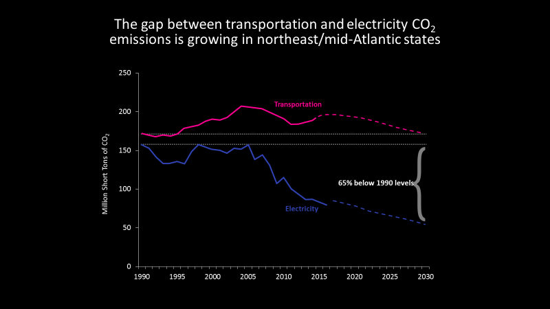 First, this region has been successful at reducing emissions from the electric sector, but transportation is lagging behind, as this graph shows: